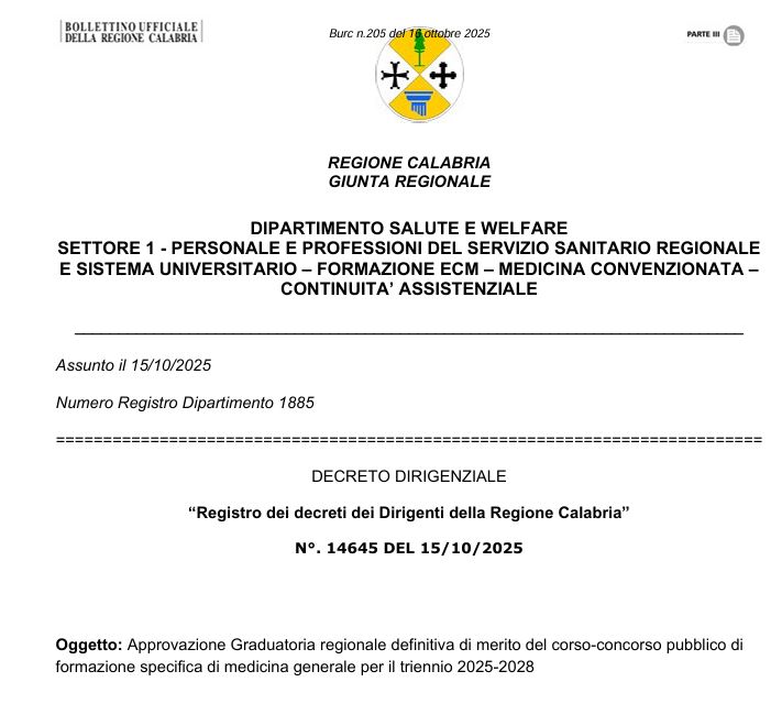 Approvazione Graduatoria regionale definitiva di merito del corso-concorso pubblico di formazione specifica di medicina generale per il triennio 2025-2028