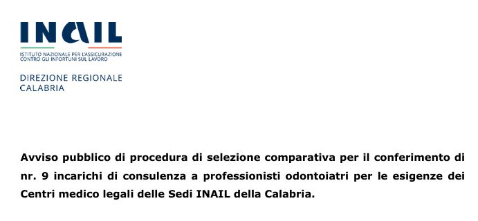 Avviso pubblico di procedura di selezione comparativa per il conferimento di nr. 9 incarichi di consulenza a professionisti odontoiatri per le esigenze dei Centri medico legali delle Sedi INAIL della Calabria.