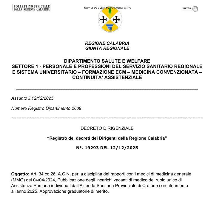 DECRETO 19293 - Art. 34 co.26. A.C.N. per la disciplina dei rapporti con i medici di medicina generale (MMG) del 04/04/2024, Pubblicazione degli incarichi vacanti di medico del ruolo unico di Assistenza Primaria individuati dall’Azienda Sanitaria Provinciale di Crotone con riferimento all'anno 2025. Approvazione graduatorie di merito.