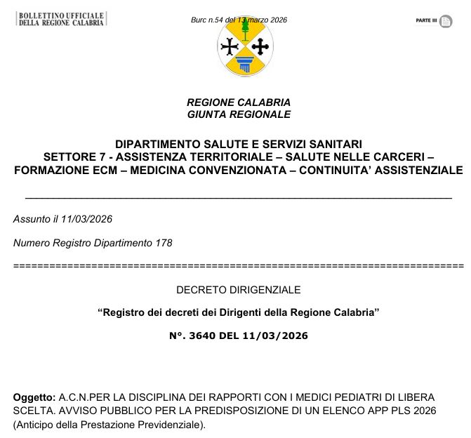 A.C.N.PER LA DISCIPLINA DEI RAPPORTI CON I MEDICI PEDIATRI DI LIBERA SCELTA. AVVISO PUBBLICO PER LA PREDISPOSIZIONE DI UN ELENCO APP PLS 2026 (Anticipo della Prestazione Previdenziale)